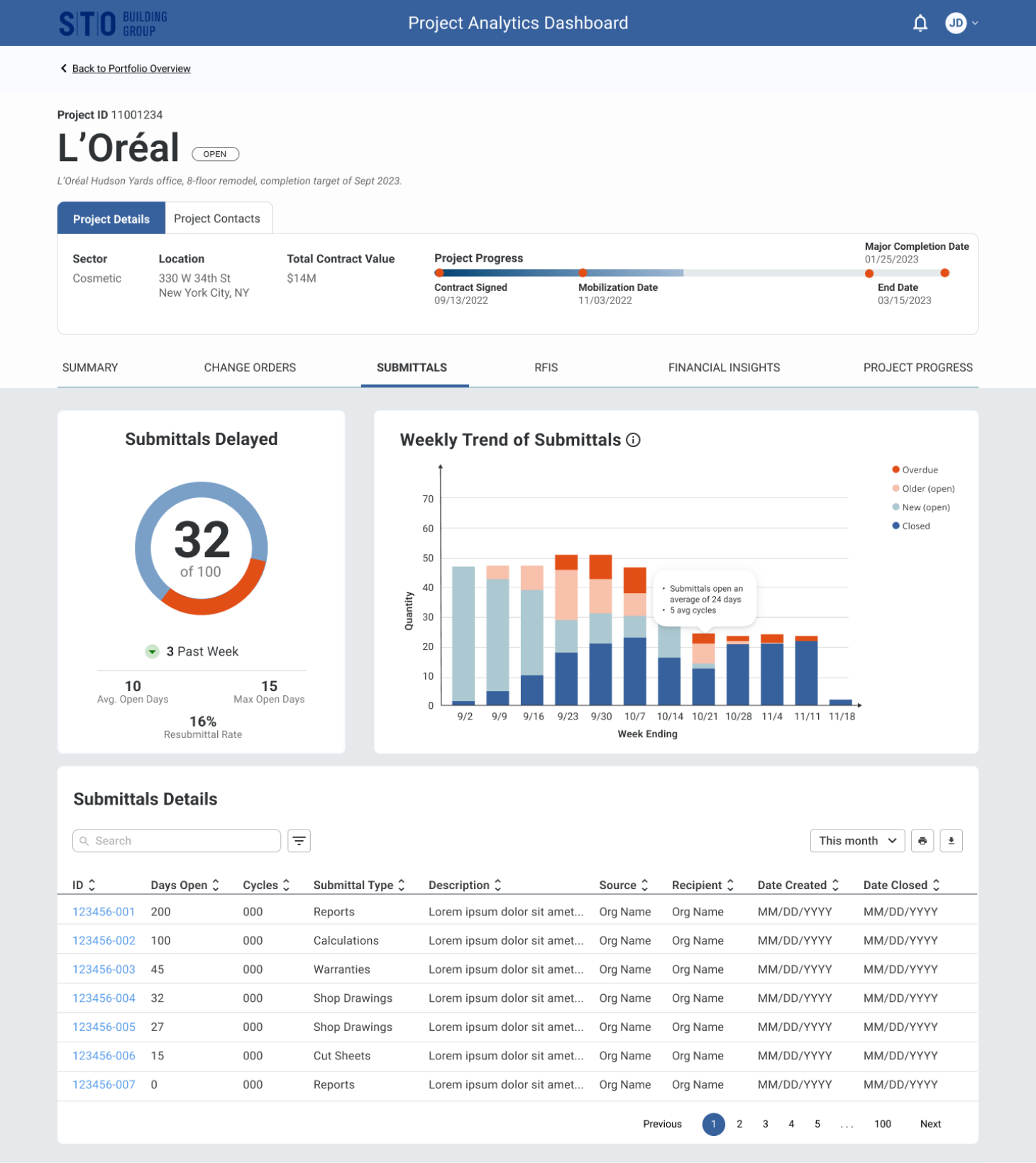 Our solution was an analytics dashboard containing a high-level view of widgets and data sets related to the user’s portfolio of projects with an ability to dive deeper into project specifics.
